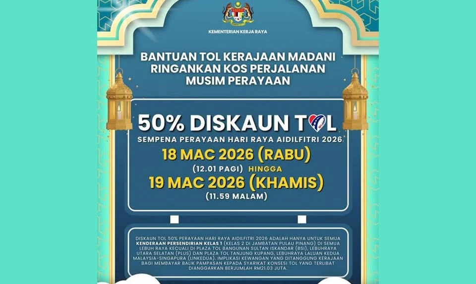 “Pelaksanaan diskaun tol ini akan bermula jam 12.01 tengah malam 18 Mac ini dan berakhir jam 11.59 malam 19 Mac 2026 membabitkan kenderaan persendirian Kelas 1 (Kelas 2 di Jambatan Pulau Pinang) di semua lebuh raya kecuali Plaza Tol Bangunan Sultan Iskandar (BSI), Lebuh Raya Utara-Selatan (PLUS) dan Plaza Tol Tanjung Kupang, Lebuh Raya Laluan Kedua Malaysia-Singapura (LINKEDUA).